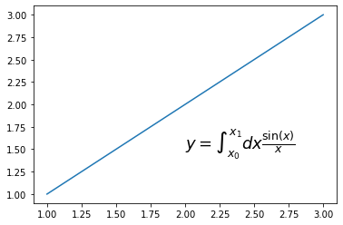 plt.text(2, 1.5, r'$ y = \int_{x_0}^{x_1}dx \frac{\sin(x)}{x} $', fontsize=18)
